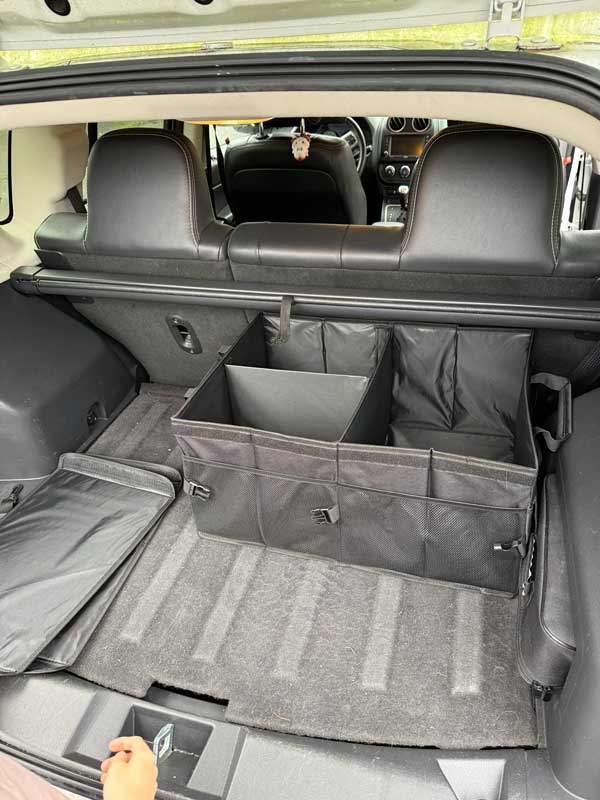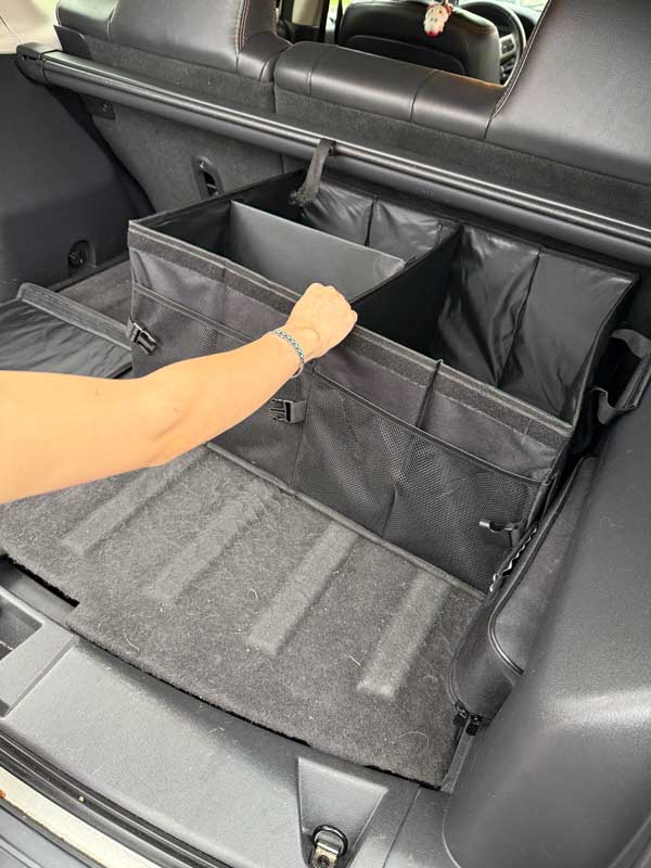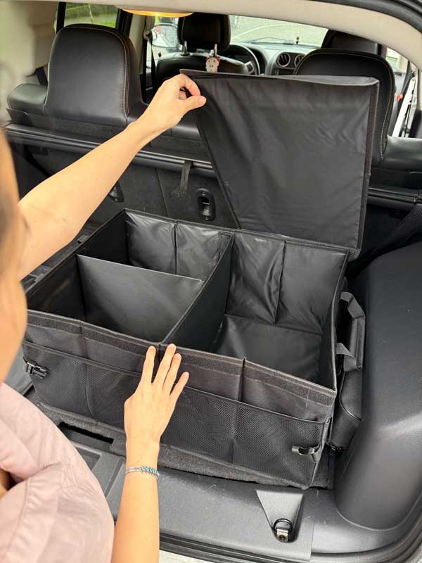 It can be easily unfolded and expanded to fit any vehicle, and its soft rubber handles make it simple to remove the organizer for the weekend. Its expandable/customizable compartment design allows for easy accommodation of clean and dirty items. Two non-slip strips with hooks are offered to secure the car cargo organizer in place during travel.
